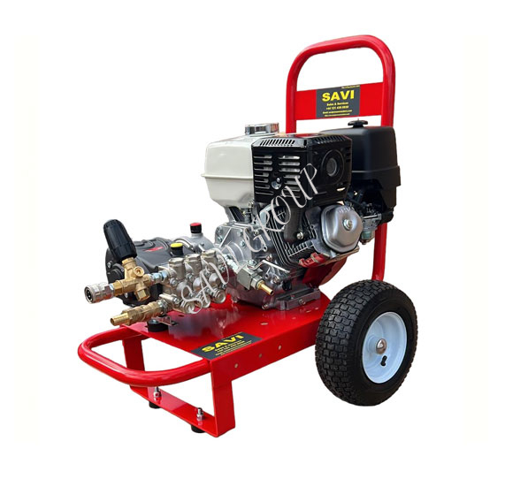 Petrol pressure washer with Honda GX 390 engine assembled with 21Ltr 200Bar pump mounted with a gearbox & heavy duty trolley with 13” pneumatic wheels.